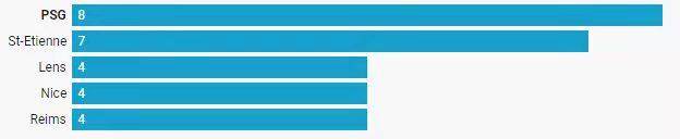 诚然,仅从过程角度,巴黎本赛季的联赛发挥有诸多为人诟病之处。然而有一点的提升同样无法抹杀:精神状态。半个赛季过去,大巴黎在法甲最后时刻不再懈怠、突然开足马力成为一大常规剧情:在伤停补时阶段,他们抢得8个积分,高出其他任何法甲球队。圣埃蒂安、朗斯与尼斯、兰斯分列这一数据的2-5位。(下图:本赛季法甲队伍伤停补时斩获积分TOP5)