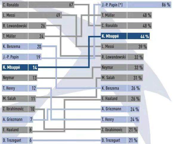52场欧冠攻入32球的姆巴佩与身前目标尚有4球差距,但场均0.62球的效率高出身前的本泽马、穆勒、伊布、内马尔与萨拉赫。其中,14粒淘汰赛进球占据总进球数的比例达到了44%,排在了梅西、莱万、内马尔等现役顶级攻击手之前,仅逊于穆勒与C罗!这一数据遥遥领先的是前法国巨星帕潘,他的效率堪称恐怖:30次欧冠登场贡献22粒进球,其中居然有19粒是淘汰赛阶段打进(下图:多位球星欧冠淘汰赛进球与所占总进球比例)。